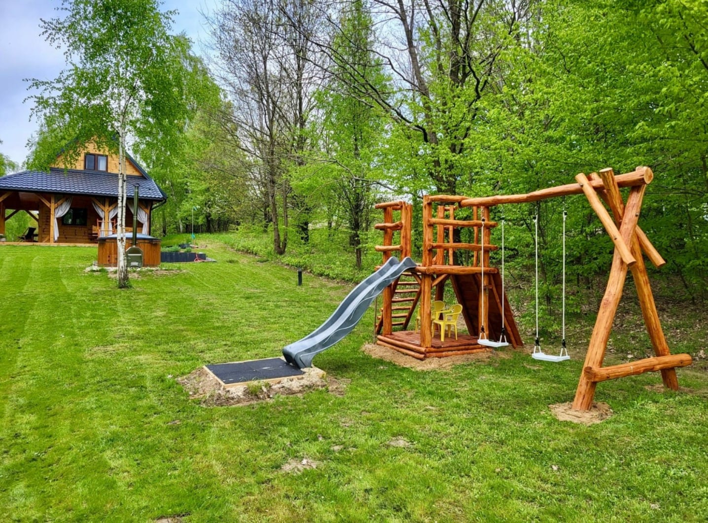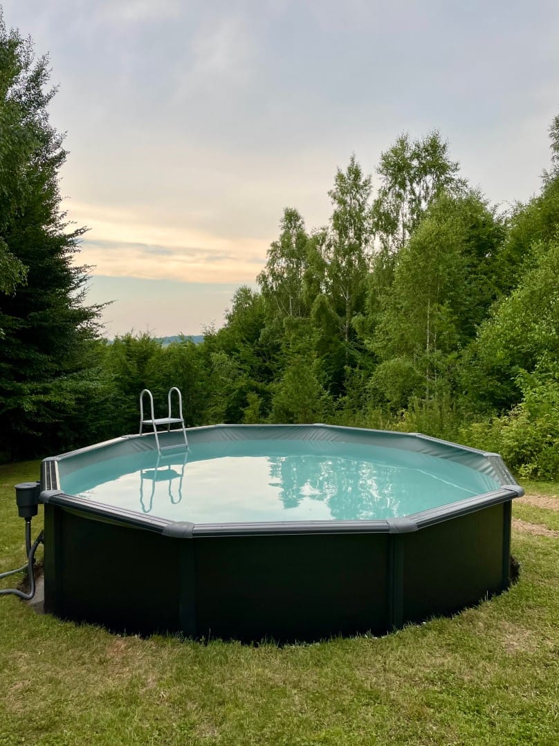 BASENNa dole działki znajduje się przestronny basen zewnętrzny o średnicy 4,6m do użytkowania w sezonie. Jest to najbardziej nasłonecznione miejsce naszego otoczenia.PLAC ZABAWDla najmłodszych gości przygotowaliśmy plac zabaw ze zjeżdżalnią, huśtawkami, ścianką wspinaczkową i zabawkami.