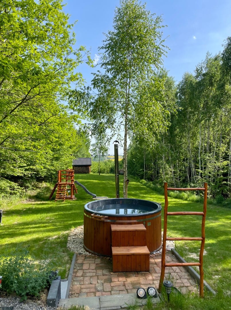 SYPIALNIA POŁUDNIOWAW pomieszczeniu znajduje się duże łóżko małżeńskie, wieszak na ubrania oraz stolik.TARASWokół południowo-zachodniej części domku znajdują się tarasy, na które można wyjść z salonu.TARASDo dyspozycji gości na zewnątrz jest stół z ławkami, leżaki ze stolikiem i hamak.JACUZZINiesamowicie relaksujące jacuzzi zewnętrzne z możliwością użytkowania przez cały sezon. Podczas kąpieli towarzyszy nam wszechobecna dookoła przyroda.ALTANAW dolnej części działki znajduje się altana ze stołem i ławkami.