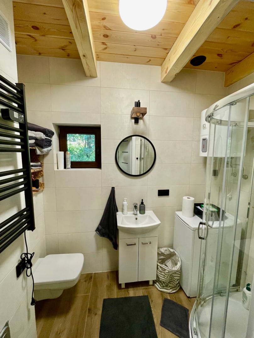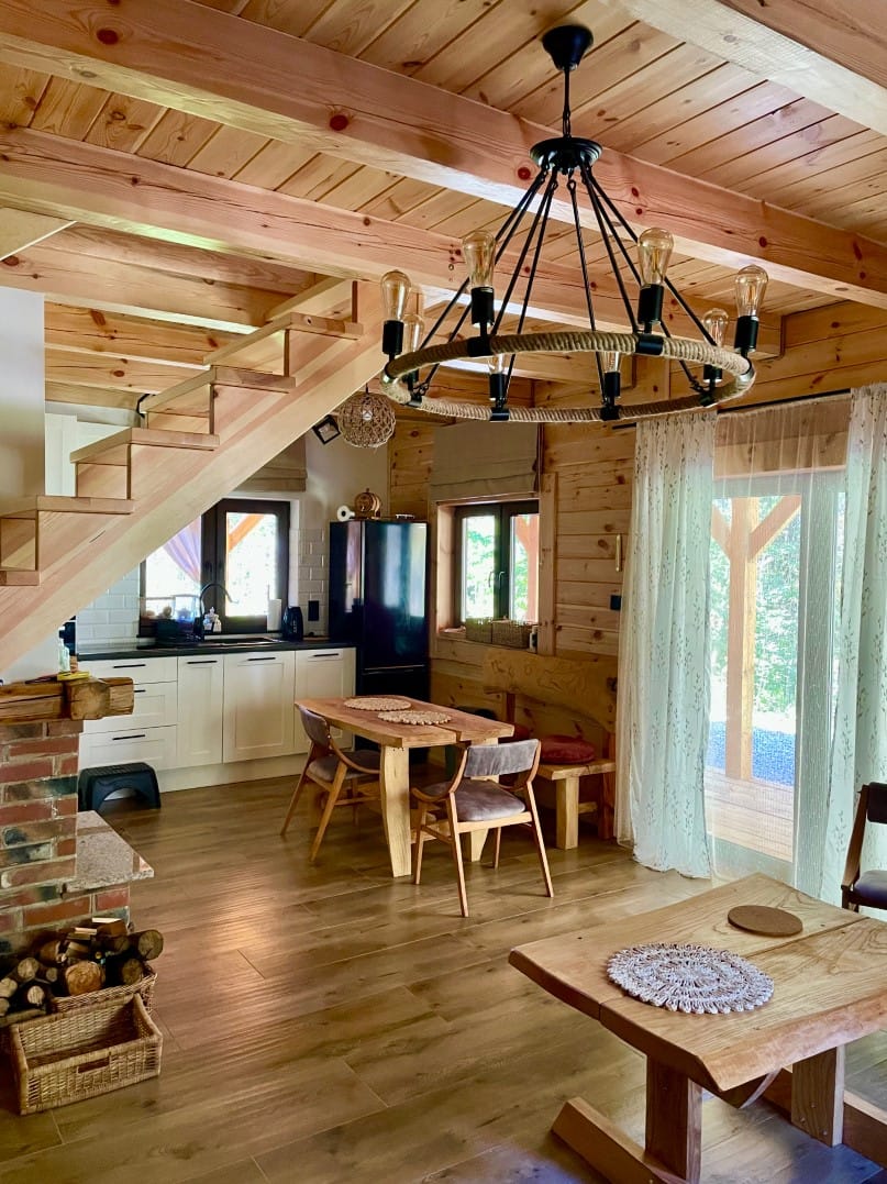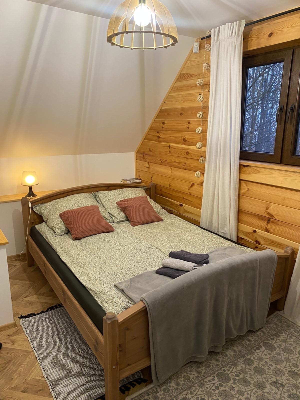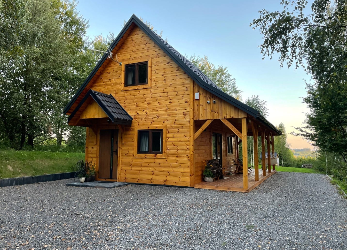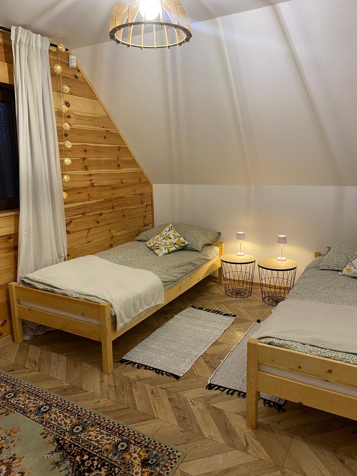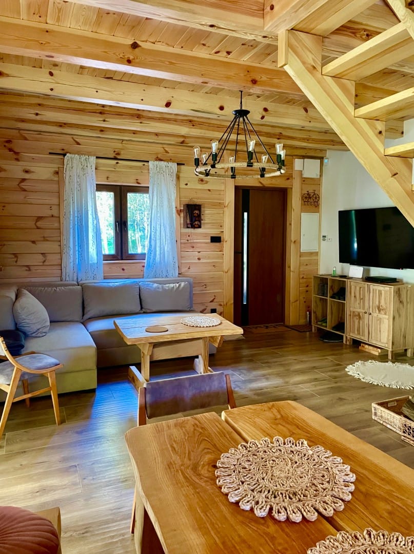 DOMEKWolnostojący domek z drewna z ogrzewaniem kominkowymDOMEKPrzed domkiem znajdują się 2 miejsca parkingowe zewnętrzne.SALON Pełne wyposażenie aneksu kuchennego, w którym znajdziecie Państwo piekarnik, płytę indukcjną, mikrofalę, lodówkę, zmywarkę, naczynia i sztućce.SALON W skład pomieszczenia wchodzą m.in. dwuosobowa, rozkładana kanapa narożna, kominek i dwa stoły.SALON Klimatyczny kominek z rozprowadzeniem ciepła po całym domkuŁAZIENKAFunkcjonalna toaleta z pralką i prysznicemSYPIALNIA PÓŁNOCNAW sypialni zaadoptowano dwa łóżka jednoosobowe z możliwością zsunięcia. Na życzenie organizujemy dostawkę dla dziecka.